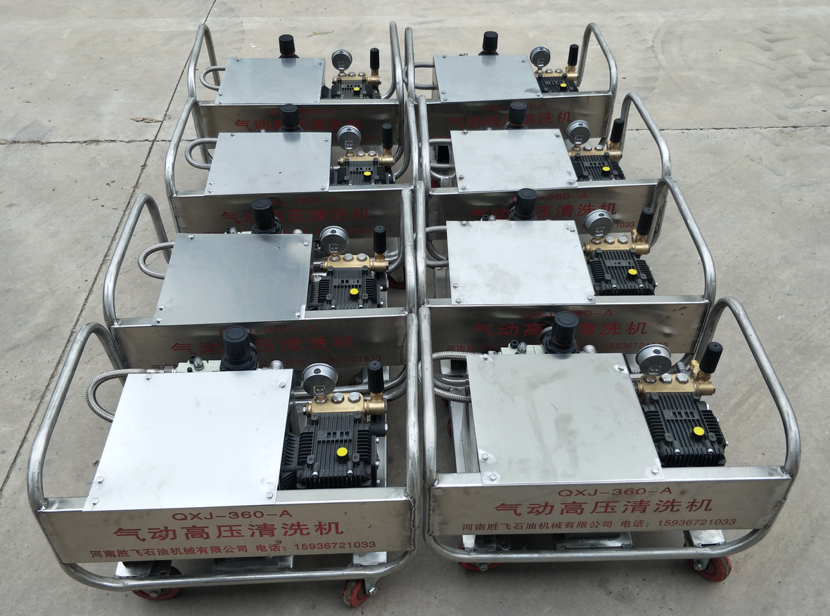 QXJ-360-A型,是河南胜飞石油机械有限公司自主研制开发的移动式高压水清洗装置,该装置采用高压柱塞泵、减速机、气动马达,框架结构采用优质不锈钢材料制作而成。具有防腐、防锈、防爆、体积小、重量轻、寿命长、结构合理、操作方便、运行安全可靠等优点。QXJ-360-A型气动高压清洗机注册商标“胜飞”,执行标准:GB/13960.12-2001。该清洗机以压缩空气为动力,驱动高压水泵,通过高压水管经高压水枪,喷射出高压水柱,用以清洗各类机器设备。气动高压清洗机与以电为动力的清洗机相比安全可靠,完全可以满足《安全法》所规定的要求。由于采用压缩空气作为动力,不会产生电火花等危险因素,尤其适合石油、化工、煤矿、易燃、易爆、高温、湿潮、粉尘等安全防爆要求高的场合使用, 也可以在紧急情况下,做应急消防灭火使用。